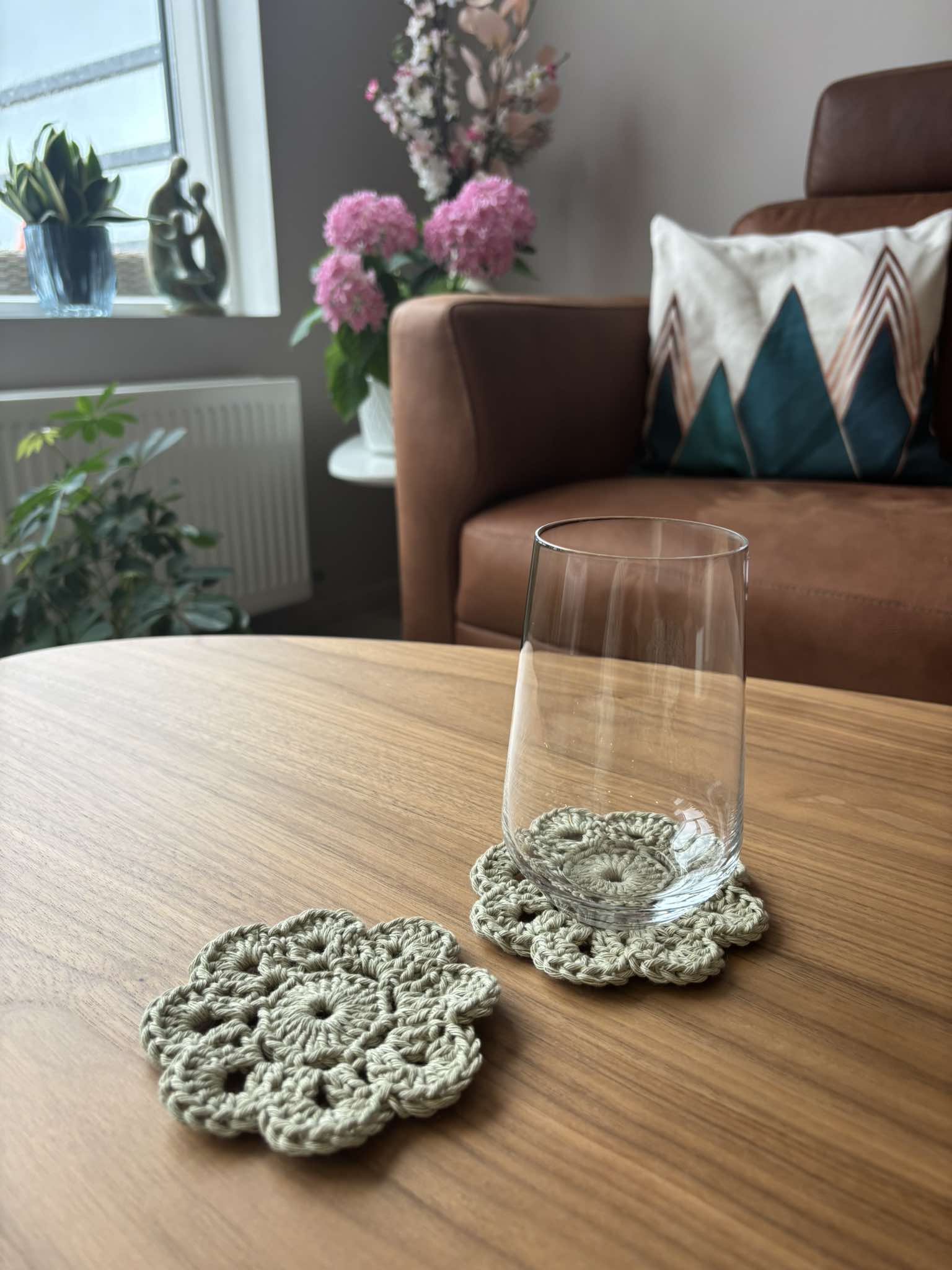 Heklaðar glasamottur gerðar úr 100% bómullargarni.